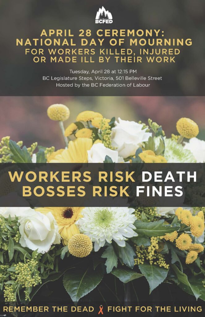 Day of Mourning April 28, 2026 at 12:15 PM - 1:15 PM BC Legislature 501 Belleville Street Victoria, BC The VLC and the BC Federation of Labour are hosting an event to honour all workers injured and killed on the job, this April 28, 2026 at the BC Legislature.